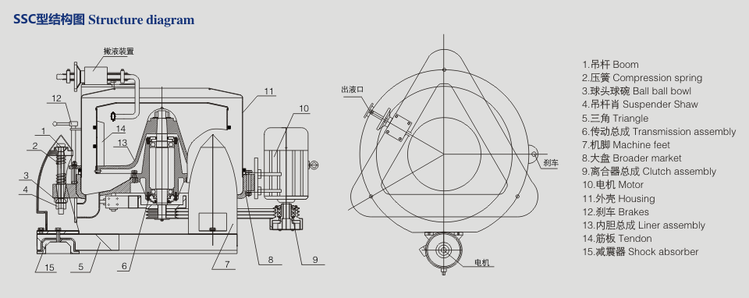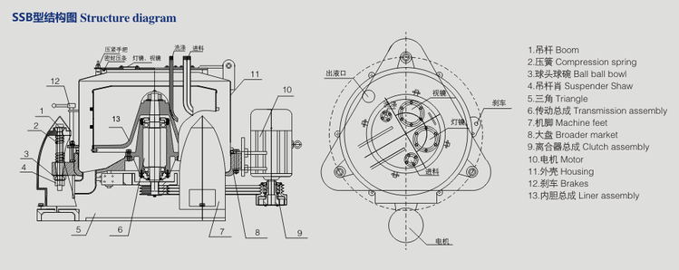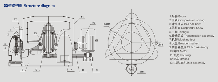 SS/SB型離心機均為三足式上部卸科、間歇操作的過濾設備。物料由上部加入轉鼓,在離心力場的作用下,液相穿過過濾介質排出機外,固相物截留在轉鼓內,停機后由人工從上部卸料。具有結構簡單、操作方便、物料不易破碎、通用性強等特點。