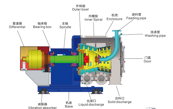 其結構特點是:離心機的工作部分采用懸臂式支承結構,易于轉配和篩網的更換,方便對離心機的工作部分采用懸臂式支撐結構,易于裝配和篩網的更換,方便對離心機轉鼓工作區的觀測;傳動部分采用于LLW型離心機相同結構,結構穩定性非常好。